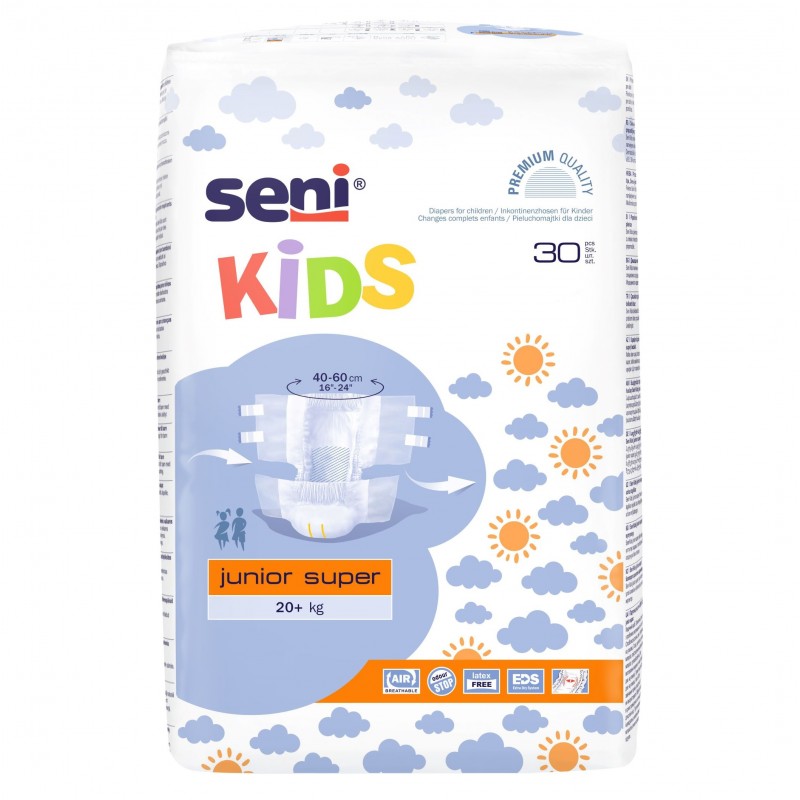 Seni Kids Junior Super - це класичні підгузники із застібкою на липучці, призначені для дітей з нетриманням сечі, які переросли традиційні дитячі підгузники та все ще потребують надійного та комфортного захисту.