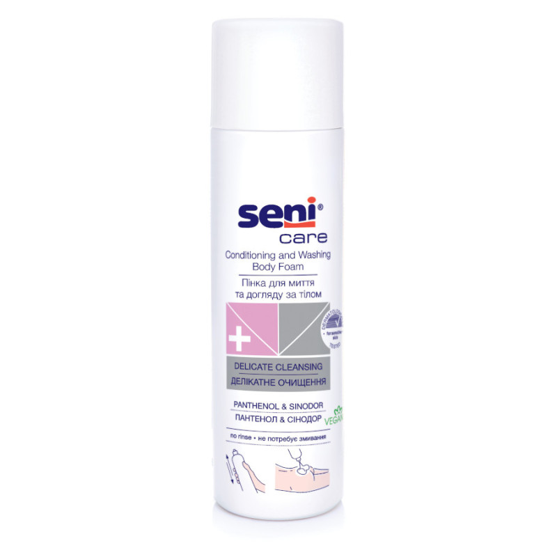 Пінка для миття та догляду за тілом Seni Care — це спеціальний засіб, розроблений для гігієни шкіри без використання води та мила. Для щоденного очищення та догляду за шкірою, схильною до подразнень. Особливо рекомендується для очищення інтимної зони при зміні абсорбуючого засобу при нетриманні сечі і калу.